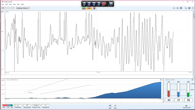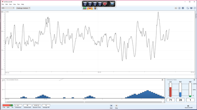 1 Visualización de la "onda de coherencia" en tiempo real. El programa "traduce" los latidos que aparecen en tiempo real en esta ventana a su grado de coherencia. Unas ondas suaves e uniformes denotan un estado coherente (no estresado) mientras ondas irregulares con muchos "picos" denotan un estado de estrés. En este ejemplo, el usuario empezó estresado, pero a medida que hizo sus ejercicios de relajación que son parte del curso de formación, fue reduciendo su estrés y como consecuencia, las ondas se volvieron más suaves.
