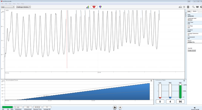Podemos ver una onda suave e uniforme. Los indicadores de porcentajes a la derecha, abajo, denotan una excelente coherencia (en verde) durante toda la sesión, con total ausencia de estrés.