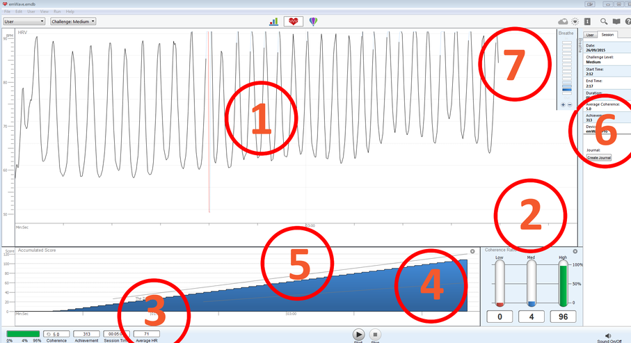 2 Porcentaje de coherencia. Las tres barras verticales debajo del numero (2) indican el porcentaje de la coherencia durante la sesión y van cambiando según se desarrolla la misma. Verde indica un alto estado de coherencia, bajo estrés. Azul indica un estado medio de coherencia, estrés medio y rojo indica un bajo nivel de coherencia, alto grado de estrés.